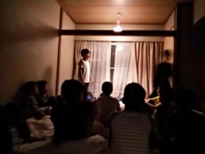 ホテル館内での肝試しは、大笑い(騒ぎ)のうちに終わりました。残りの時間は各部屋ごとで工夫して楽しんでいます。