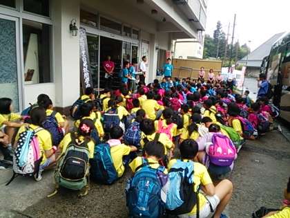 閉室式では雨があがりホテルの前で行いました。バスに乗って、日光江戸村にむかいます。