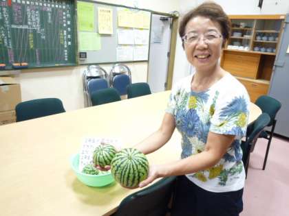 ついに、秘密にしていたスカイが収穫されました。やはり気候的にもう育ちにくくなっているのか、茶色に変色したものが出てきたので、2年1組の前の花壇に植えられていたので、小倉先生が収穫してくださいました。主事さんたちの手入れや先生の水やりなどによって、写真のような小玉のスイカが実りました。学校の花壇で育つんですね。来年も挑戦してみたいです。スイカはしばらくは、職員室前に展示しておくそうです。見てください。