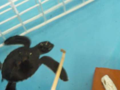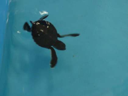 「1号」と「2号」とも、とても元気です。今は、主事の中山さんと鈴木さんが、うなぎの粉を団子にして、米粒大の大きさの塊を割りばしの先に付け、食べさせています。1日3回、1回に5〜6粒食べるそうです。底に沈んだえさも、潜ってしっかり食べられるようになっています。とてもかわいい様子が見られます。