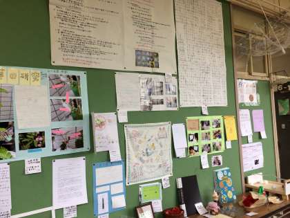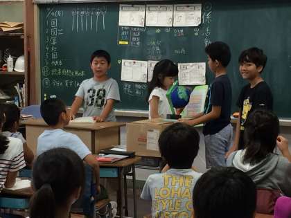 2学期が始まって、どのクラスも自由研究を掲示しています。1年生は今日、子どもと一緒に掲示をしています。6年生の作品はさすがです。4年生は、自由研究の発表会をしていました。