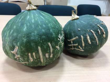 カボチャに「玉川小学校」と書かれています。このカボチャは、毎年玉川小学校出身で現在香川県にお住まいの方から送られてきます。