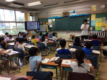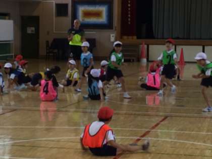 2年生は体育館で体育です。みんな元気に動き回っています。1年生は算数の学習です。みんな真面目に取り組んでいます。