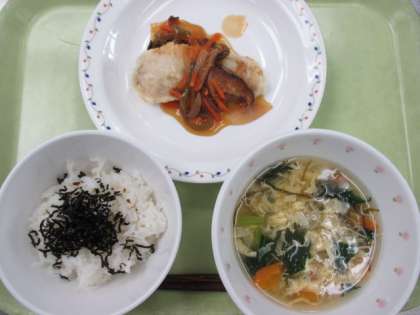 ごはん 韓国風ふりかけ 牛乳 魚の甘酢あんかけ 卵スープ