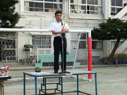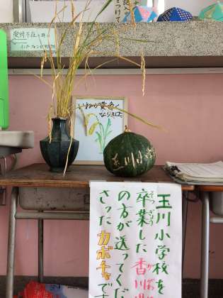 朝会では、校長先生が「秋」の様子についてお話ししました。学校で実った稲穂や香川県から送られてきたカボチャを見せて、お話ししました。だんだん秋の様子が見えてきますね。