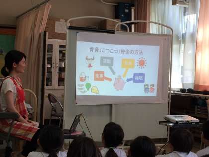 また、「すこやかタイム」では、「骨」について学びました。一番骨が成長する今の時期にしっかり「こつ(骨)こつ(骨)貯金」をして、骨の質を丈夫にしましょうというお話です。