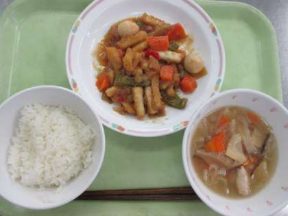 ご飯 牛乳 いかとじゃが芋の揚げ煮 ささみのスープ
