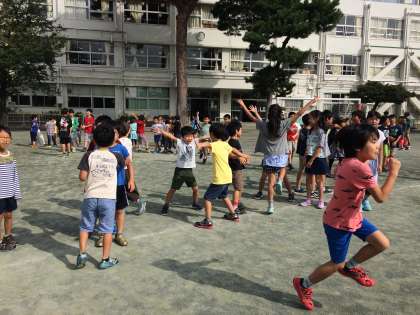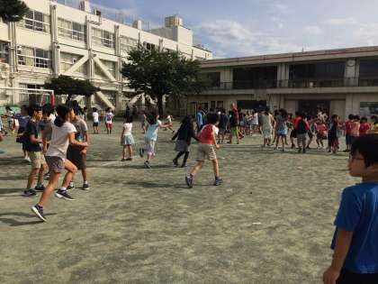 今朝は、2年、5年、6年の玉チャレでした。みんなで体を動かします。体を使ったジャンケン、スキップ、ケンケン、サイドステップなどを使って楽しく運動をしました。来週は、1年、3年、4年が挑戦します。