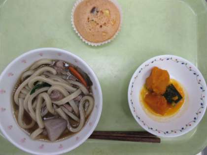 けんちんうどん 牛乳 かぼちゃの含め煮 きなこ蒸しパン