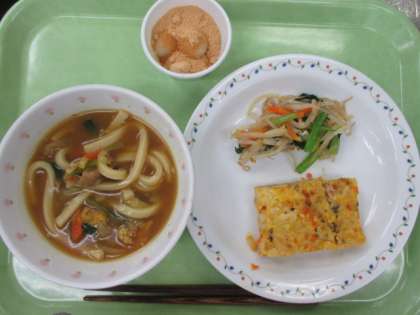 カレーうどん 牛乳 擬製豆腐 野菜の辛子醤油あえ 月見団子