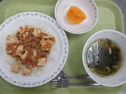 麻婆豆腐丼 牛乳 わかめスープ 果物(柿)