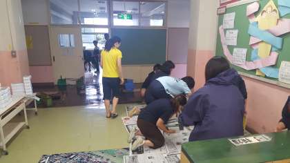 台風で今日は休校となりました。強く降った雨が校舎内にもかなり入り込みました。おやじの会、学校協議会、学校運営委員会、その他の方々にもお手伝いいただき、なんとか復旧できそうです。ご協力ありがとうございました。