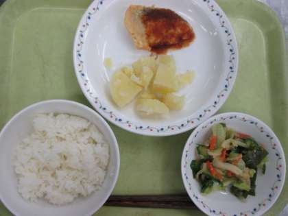 ごはん 牛乳 魚のステーキソース 粉ふきいも わかめサラダ