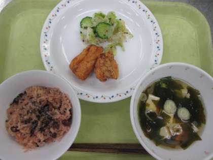 赤飯 牛乳 鶏の唐揚げ ゆかりあえ すまし汁
