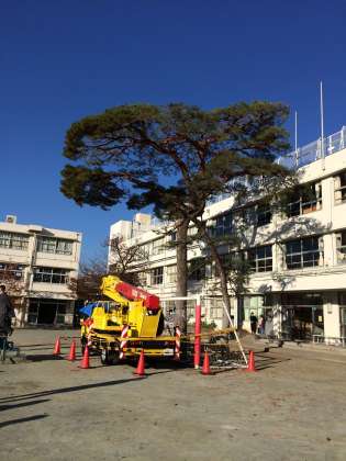 土曜日から松の木の剪定が入っています。松の葉が排水溝にたまり詰まってしまうので、木を剪定しています。