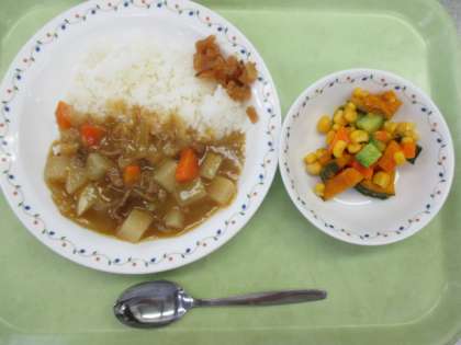 大根カレー 牛乳 福神漬 パンプキンサラダ