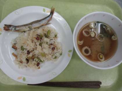 まめまめおこわ 牛乳 焼きししゃも 具だくさん汁