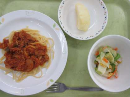 スパゲティミートソース 牛乳 ポテト入りフレンチサラダ りんご