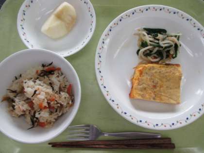 ひじきごはん 牛乳 切り干し大根の卵焼き おひたし ラ・フランス