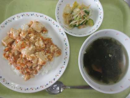 麻婆豆腐丼 牛乳 白菜の中華サラダ わかめスープ