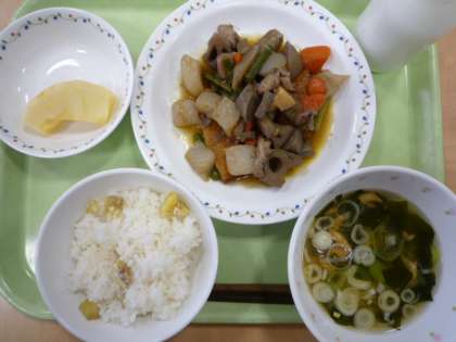 今日の給食は、メニューにはない、「栗ごはん」が出ました。どうしてかというと、学校協議会のメンバーである木村さんから、自宅でとれた栗を学校でいただいたからです。全部で約3〜4キロくらいもある一個一個が大きな栗を、今日は子どもたちもおいしそうにいただきました。石井栄養士さんとスエヒロの給食調理員の方々の温かいご好意によって実現しました。ごちそうさまでした。