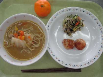 サッポロラーメン 牛乳 じゃがまるくん のり酢あえ 果物(みかん)