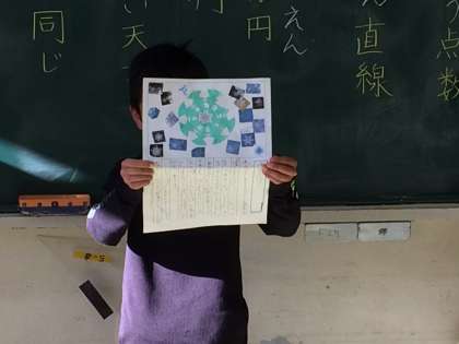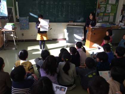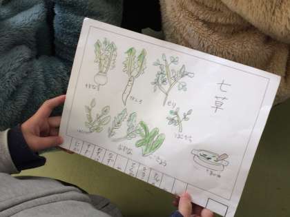 2年生で冬休みに見つけた「冬」の発表会をしていました。お正月の料理や、氷、雪の結晶などなど、子どもたちが気がついたことを調べて発表していました。