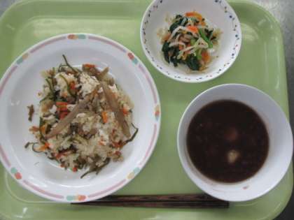 豚肉とごぼうのごはん 牛乳 野菜のごまだれかけ 白玉しるこ