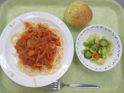 スパゲティ地中海ソース 牛乳 野菜のレモンしょうゆかけ