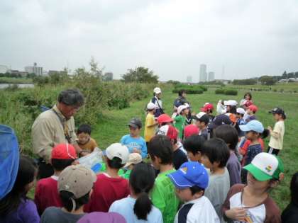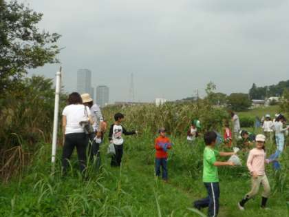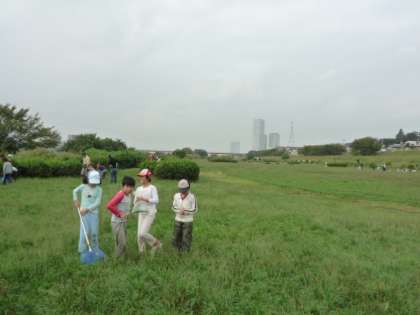 3年生は、今日の午前中を使って、学区域内の多摩川を2つのグループに分かれて探検しました。1つが、土手に住んでいる虫探し。もうひとつのグループが、川の中に住んでいる生き物探しです。土手の虫探しでは、コオロギ、カマキリ、イナゴ、殿様バッタ、ショウジョウバッタ、カメムシなどなと、いろいろな虫を探すことができました。水辺の楽校の方に、名前を教えてもらいました。