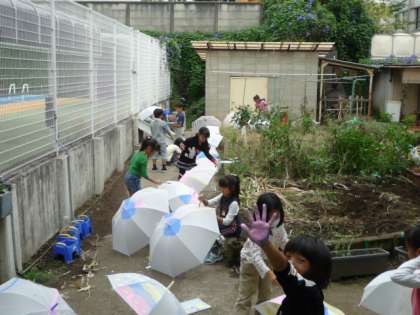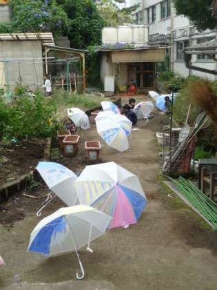 2年生は、今年の展覧会の作品に、傘に模様をつけたものを制作しています。どんな作品になるかとても楽しみです。今日は、中庭に傘を出して、、思い思いに色をつけていました。
