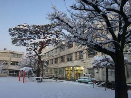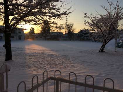 おはようございます。今朝の学校の様子です。雪がしっかりつもっておだやかな朝です。夜明け前の校庭は静かで清々しいものです。