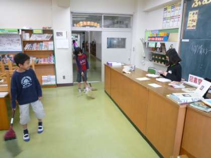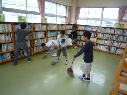 掃除の時間、図書室のほうへ足が向かいました。4年2組の子どもたちが掃除中でした。男子5人と女子1人で場所の分担をしながら、おしゃべりもせず、一生懸命ほうきでごみを集めたり、本の整理などを行っていました。とても立派でしたので写真にとってホームページに出すことにしました。