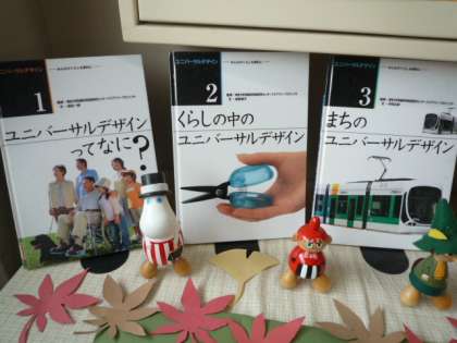 図書室前の階段の壁に、ユニバーサルデザインの本が何冊か紹介されています。これは、今度の日曜日に行われる「森の児童館まつり」の中で行われる「住みやすい街ってどんな街」というクイズの参考になる本です。ぜひ、この本を読んで、森の児童館祭りのクイズに答えてください。すばらしい景品がもらえますよ。森の児童館祭りは、12時から3時くらいまでです。
