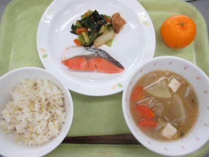 雑穀ごはん 牛乳 魚の塩焼き 青菜と生あげの煮浸し 根菜の味噌汁