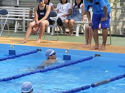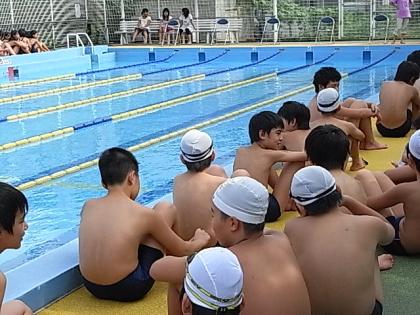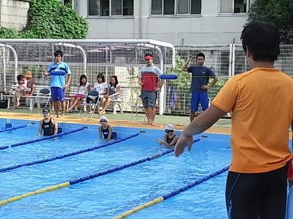 今日の午後、6年生が水泳記録会を開催しました。これは、世田谷中の小学校6年生が、それぞれの学校で記録会を行い、その記録を各校が出し合って競う形を取ります。本校では、初めに百メートル自由形と平泳ぎ、50メートルの自由形と平泳ぎ、25メートル自由形と平泳ぎ、背泳ぎの個人種目を行いました。そのあと、学級対抗の男女別25メートル×8人リレー、選抜50メートル×4人リレーを行いました。