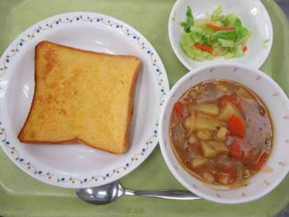 フレンチトースト 牛乳 ビーンズシチュー きゃべつサラダ