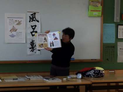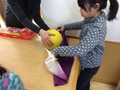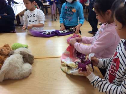 3年生がブックトークで風呂敷体験をしました。風呂敷のお話を聞いて、実際に風呂敷を使っていろいろなものを包む練習をしました。瓶を包むのがおもしろいとみんな言っていました。とてもよい体験でした。