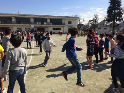 2月に入ってなかなか校庭が使えませんでしたが、大縄跳び「みんなで跳ぼうに挑戦」でした。やっと先週から校庭が使えるようになって、低学年が大縄跳挑戦しています。学年やクラスによっていろいろなやり方で挑戦しているようです。