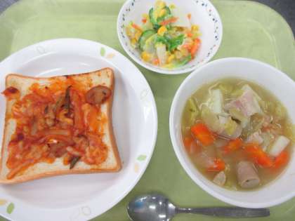 ピザトースト 牛乳 ポトフ 白菜とコーンのサラダ