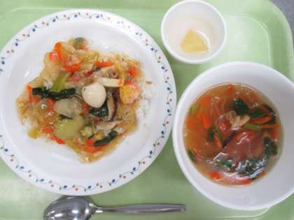 八宝菜丼 牛乳 春雨スープ 杏仁豆腐