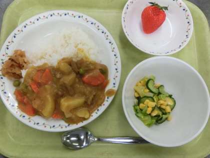 カレーライス コーヒー牛乳 福神漬 フレンチサラダ いちご