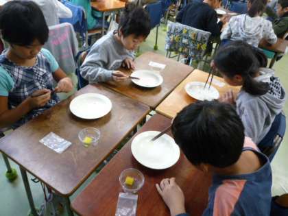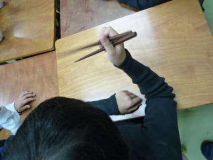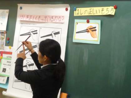 今日の2時間目、3年4組で、教育実習生の栗村先生が、「正しい箸の持ち方」についての指導をしました。子どもたちに正しい箸の持ち方をする理由などを考えさせた後、実際には血の持ち方や使い方の練習も行いました。なかには、もち方が悪く、豆に見立てたビーズをうまくつかめない子も数人いましたが、練習を通してほとんどの子どもが上手に使ってつかめるようになってきました。ちょっとした練習の積み重ねで、すぐに子どもたちは身に付けることができるのに驚かされます。