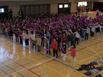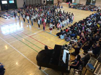 今日の3,4時間目は6年生を送る会でした。まずは6年生が花のアーチをくぐって入場します。はじめの言葉の後は、各学年の出し物です。1年生は、「はじめの一歩の歌を歌いました。2年生は「雨のちハレルヤ」をバンダナを振りながら歌ってくれました。