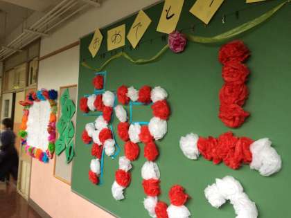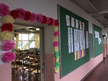 明日の4年生「1/2成人式」の準備をみんなでやっています。廊下の飾りもだんだんできあがっています。