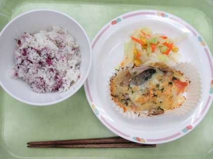 ゆかりごはん 牛乳 魚のマヨネーズ焼き コーンサラダ