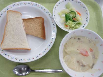 二色サンド 牛乳 クリームシチュー アスパラガスのサラダ
