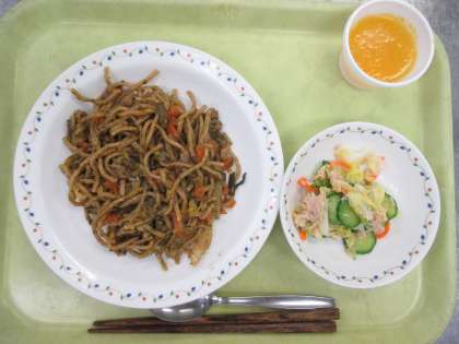 ソース焼きそば 牛乳 ツナサラダ みかんゼリー