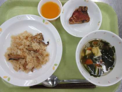 中華おこわ 牛乳 鰹のたつた揚げ すまし汁 キャロットゼリー