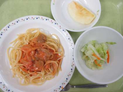 スパゲティトマトクリームソース 牛乳 春キャベツのサラダ りんご